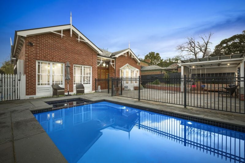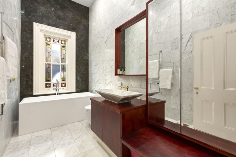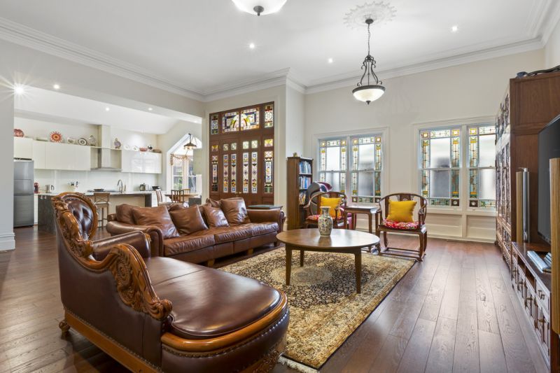 Featuring four expansive bedrooms, including an oversized master with walk-in robe and full marble ensuite, the home also comprises an elegant central marble bathroom with freestanding bath, and a second central bathroom and laundry. Soaring ceilings with ornate decorative mouldings, glossy hardwood floors and breathtaking original leadlight glass feature throughout the home, blending seamlessly with the quality contemporary additions. The impressive main residence is further complemented by the original stable building, which has been converted into a fully self-contained apartment, which includes a living room, loft bedroom, study and bathroom.