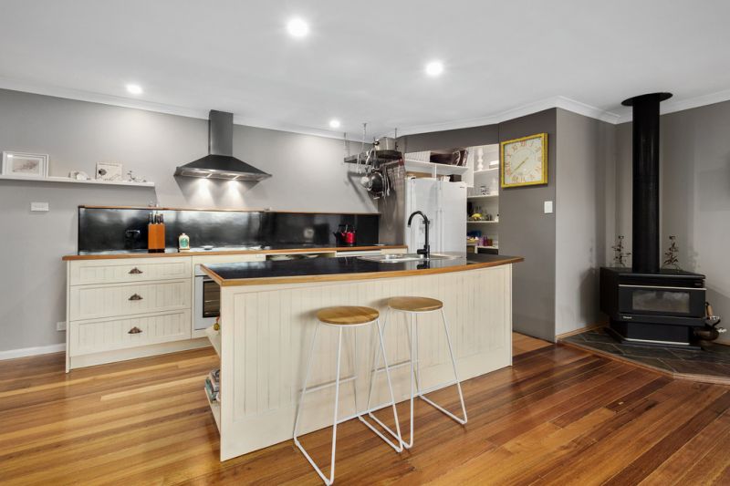 The spacious open plan timber country kitchen includes generous storage and preparation spaces, a walk-in pantry and an oversized island bench.