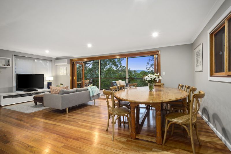 Comprising distinct formal and relaxed family living spaces, the home features an elegant skylit formal living room and an expansive open plan living and dining room, boasting quality timber bifold doors which open directly out to an impressive alfresco entertaining space, equipped with air conditioning and showcasing enviable treetop views. This alfresco space wraps around the home, flowing out to a spacious sun drenched decking, ideally laid out for effortless year round entertaining.