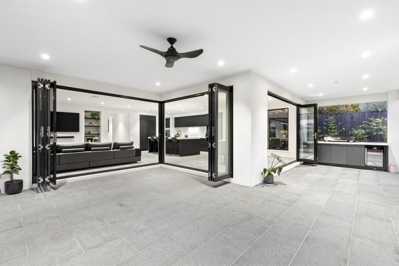Drenched with sunlight via floor-to-ceiling windows, an expansive open plan living and dining room flows directly out to a spacious alfresco area with outdoor kitchen, perfectly laid out for effortless year-round entertaining. Adjacent, a north facing manicured lawn is framed by low maintenance established gardens.