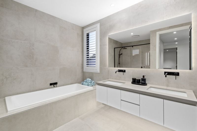On the upper floor, a spacious living room leads to an oversized master retreat with twin his-and-hers dressing rooms, and an indulgent resort-style ensuite featuring a freestanding soaker bathtub, twin waterfall shower, matte black Phoenix tapware and a double stone vanity, with a separate master powder room. Three large additional bedrooms - including two with walk-in wardrobes - are serviced by a central bathroom with separate bathtub, double stone vanity, floor-to-ceiling tiling and a separate powder room.