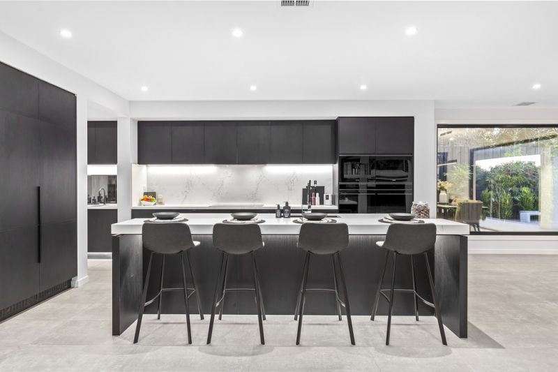 At the heart of the home, a showpiece kitchen comprises a fully integrated French door Liebherr fridge / freezer, and a collection of premium Smeg appliances including a 900mm induction cooktop, side-by-side ovens, wine fridge and plumbed coffee machine. An oversized island bench with elevated breakfast bar is complemented by a generous butler's pantry with chic window splashback.