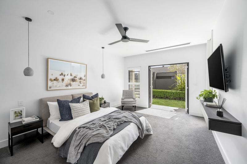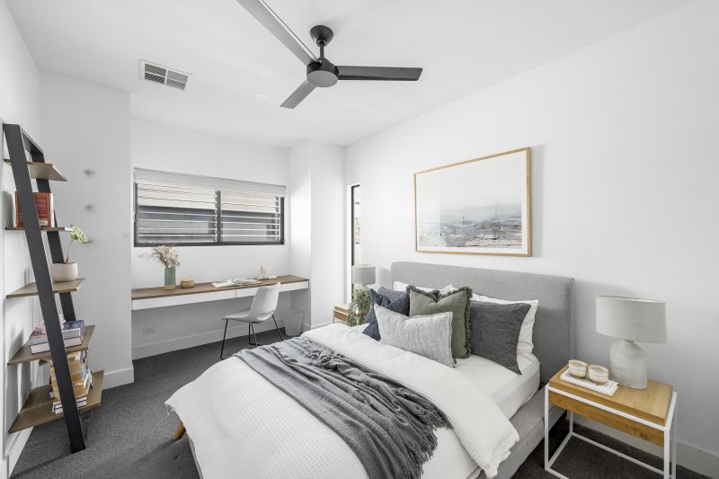 A stunningly landscaped entry sets the tone right from the start, while inside, eye-catching timber floors flow throughout much of the ground level which offers an abundance of space and flexibility. The master bedroom has the benefit of a ground floor location, and features a walk-in robe and sumptuous double vanity ensuite with a skylit rain shower. The front of the property also enjoys a handy study with built-in shelving and storage which is perfect for those who love working from home.