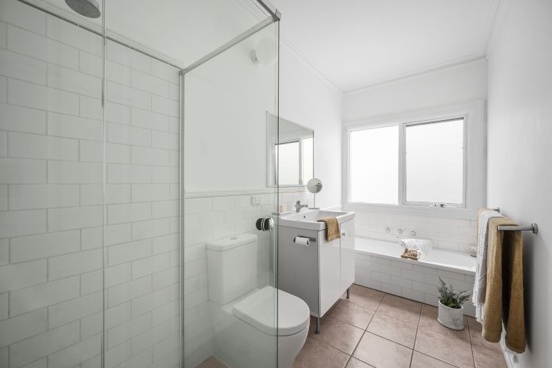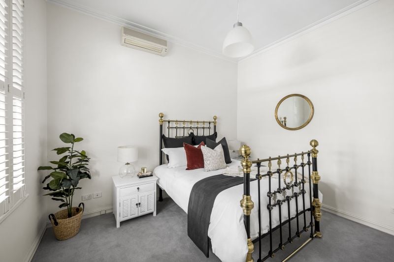 Marrying heartwarming period charm with a tasteful modern feel, this striking and quiet abode has so many appealing delights you'll never tire of. A small yet flourishing garden at the front has been curated and landscaped to perfection, and adds a slice of green tranquillity before you even step inside. Once you do, you'll be inspired by the soaring ceilings, elegant plantation shutters, and premium hardwood flooring, as well as two bedrooms with built-in robes which are positioned towards the front of the layout.