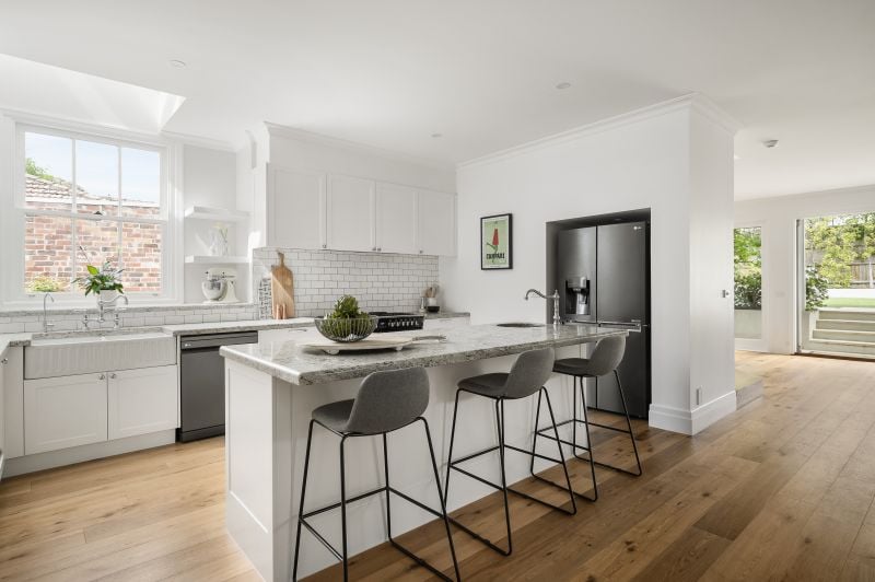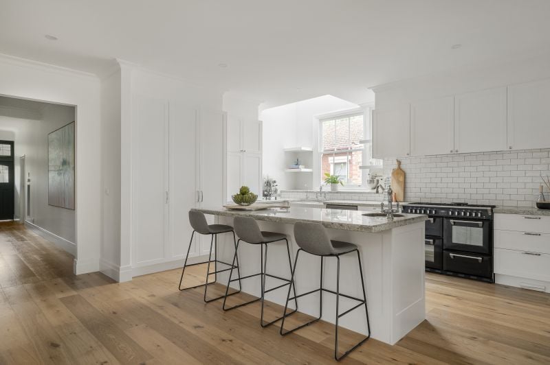 Elevated by stunning oak floors, high ceilings and an abundance of natural light and warmth throughout, the home cascades across two beautiful levels and includes a formal lounge with gas fireplace, an open plan living/dining zone with alfresco access plus a designer kitchen with a prestige Belling 'Richmond' oven, granite benchtops and timeless shaker-style cabinetry.