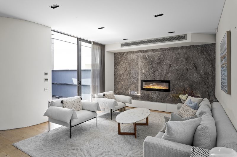 Conveniently lit steps guide you through to the frosted glass door, and into the formal lounge which features Classic oak timber flooring and is clad in a feature marble wall with a central electric fireplace to warm the coldest of winter nights.