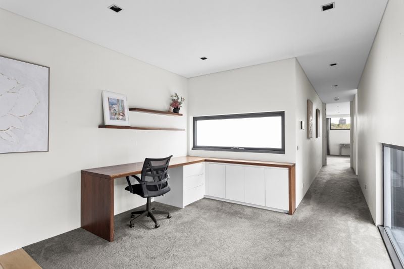 Upstairs via the feature staircase, you'll find a light filled-study, three beautifully appointed bedrooms, which feature plush carpet, private en suites and built in robes. Additionally, the master bedroom is equipped with bath and full-sized walk-in robe.