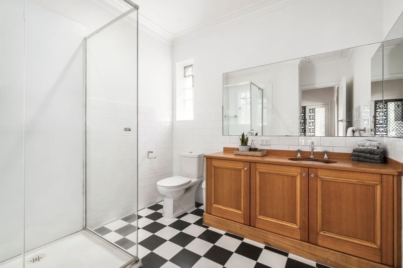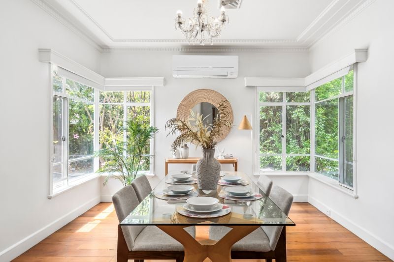 Accessed via the service lane and set behind a generous leafy front garden, the accommodation features lofty ceilings and original hardwood floors through the social areas of the layout which comprise a huge lounge and elegant separate dining zone.