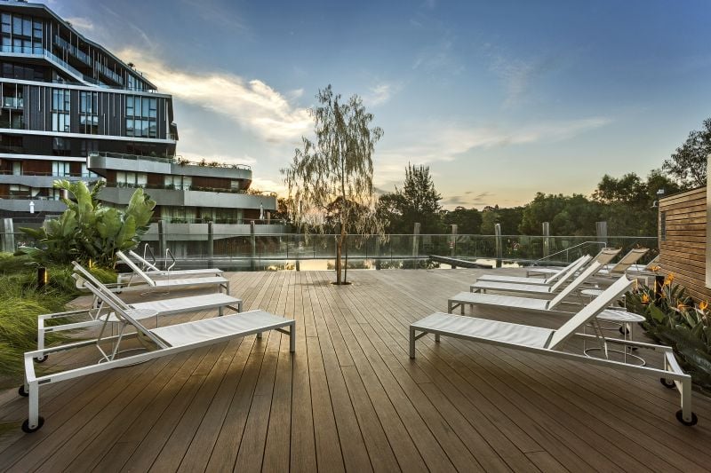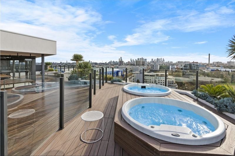 The stylish and expansive complex offers extraordinary rooftop relaxation with incredible views of the city and the Yarra River, as well as a lobby bar & lounge, business centre, resident courtyards, gym, pool & hot tubs.