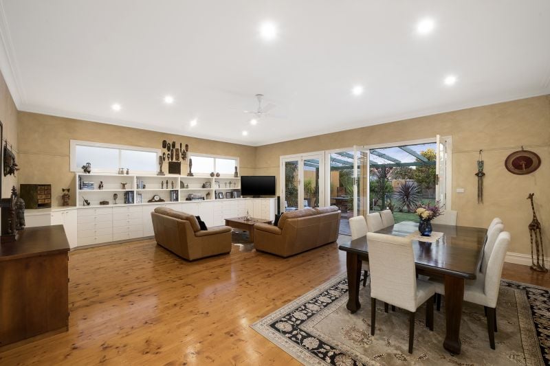 - Open plan living and dining room with built in cupboards