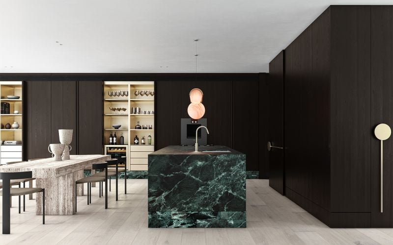 Each residence is a masterpiece of design and craftsmanship, defined by light-filled interiors and timeless sophistication. At the centre, a statement green marble island becomes both a culinary and visual showpiece, complemented by premium appliances and refined finishes. Generous bedrooms, luxurious bathrooms, and thoughtfully layered textures form interiors that inspire calm and comfort. With secure parking for two vehicles and the convenience of direct lift access, these homes embody effortless prestige living.