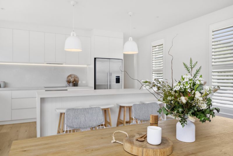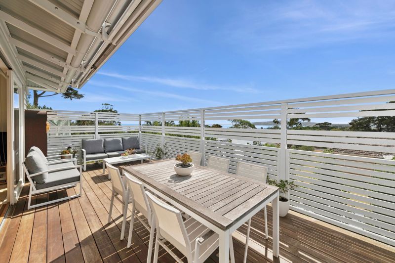 Upstairs Elevated Luxury & Bay Views Light-filled open-plan living and dining with sweeping views of the bay and Mt. Martha.