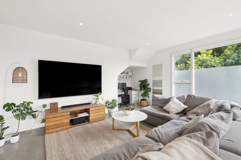 Downstairs Space, Comfort & Flexibility Second living area with polished concrete floors and direct access to lush green lawns.