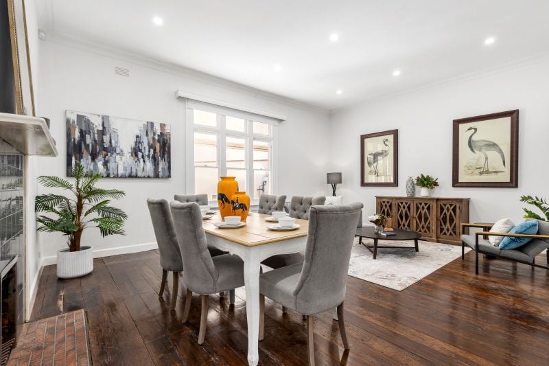 The four-bedroom 1920s red brick home flaunts tall 3.6m ceilings and original Kauri timber floors. Previously extended and renovated, the well-proportioned interior has a fantastic sense of space throughout. The huge 45sqm rumpus room serves as a large bedroom, studio or oversized lounge with original 3m window and electric block-out blinds. All bedrooms feature new full-wall 2.4m wardrobes, while bathrooms shine in white gloss porcelain with new toilet and vanity (double vanity and under tile heating to the ensuite). Extras include a large laundry, alarm system, Ethernet router, instant gas hot water, gas ducted heating and ducted evaporative cooling. A private backyard completes the home with slate paving, large north-facing lawn and secure rear entry gate.