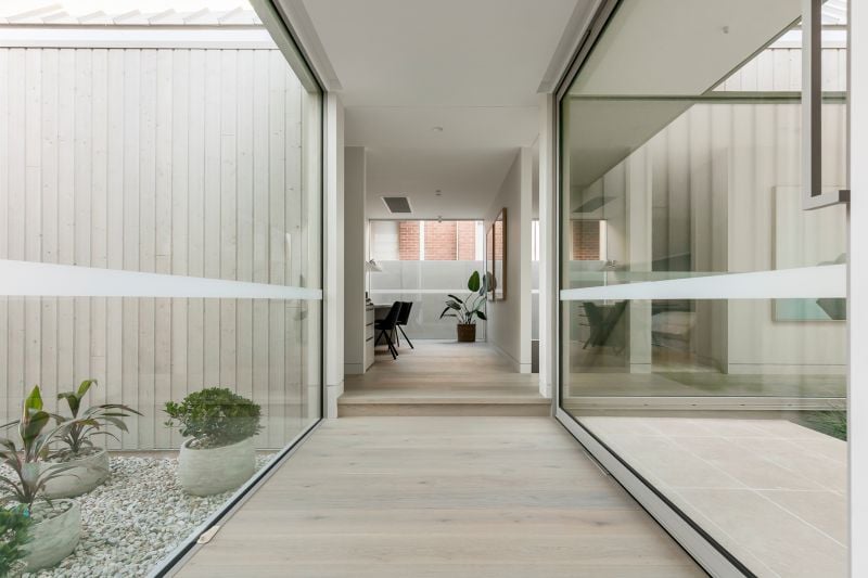 The two distinct sections of the property create a natural zoning for the accommodation, which is welcomed by a massive glass pivot door that swings open to views of a framed atrium garden.