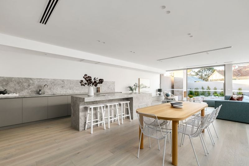 Entertainers will be at home in the open plan living/dining zone where a luxurious Turkish Marble kitchen showcasing a suite of integrated Miele appliances, custom cabinetry and a full butler's pantry with shopper's access is the headline act.